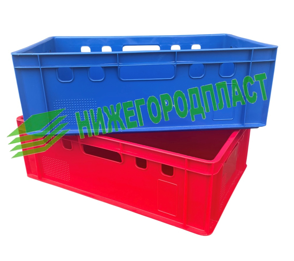 Пластиковый ящик Е2, соответствующий европейскому стандарту, используется для мяса, колбасы и различных полуфабрикатов, наиболее частое применение нашел во внутрицеховой логистике на мясных предприятиях. Тара оснащена ручками, сплошные дно и стенки помогают избежать подтеков и разлива жидкостей и надежно защищают продукты от механических воздействий. Штабелируемая конструкция обеспечивает их уверенную фиксацию друг на друге. Конструкция ящиков позволяет быстро охлаждать и замораживать содержимое. Данный ящик изготовлен из пищевого пластика, что позволяет использовать его на пищевых предприятиях.